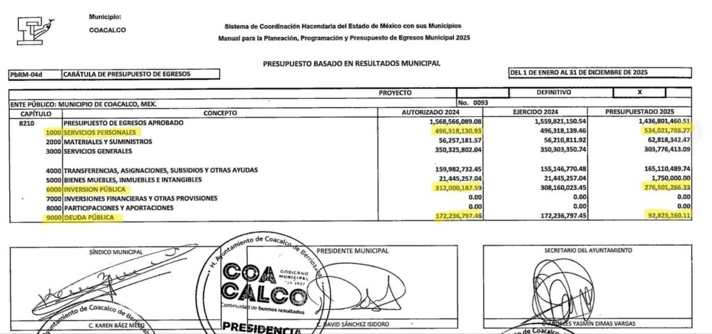 Gobierno de Coacalco cierra 2025 con gasto histórico en nómina de 534 millones y recorte de 31 millones en inversión pública