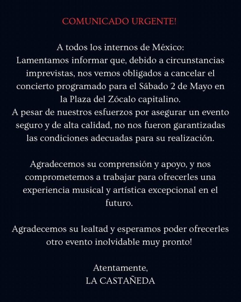 Toluca, Estado de México.- Tras el reciente anuncio sobre la cancelación de su presentación en el Zócalo de la Ciudad de México, programada originalmente para el 2 de mayo, la agrupación La Castañeda ha confirmado su participación en un escenario distinto para este cierre de mes: una primera edición de un festival a realizarse en los campos del municipio de Tonanitla.
